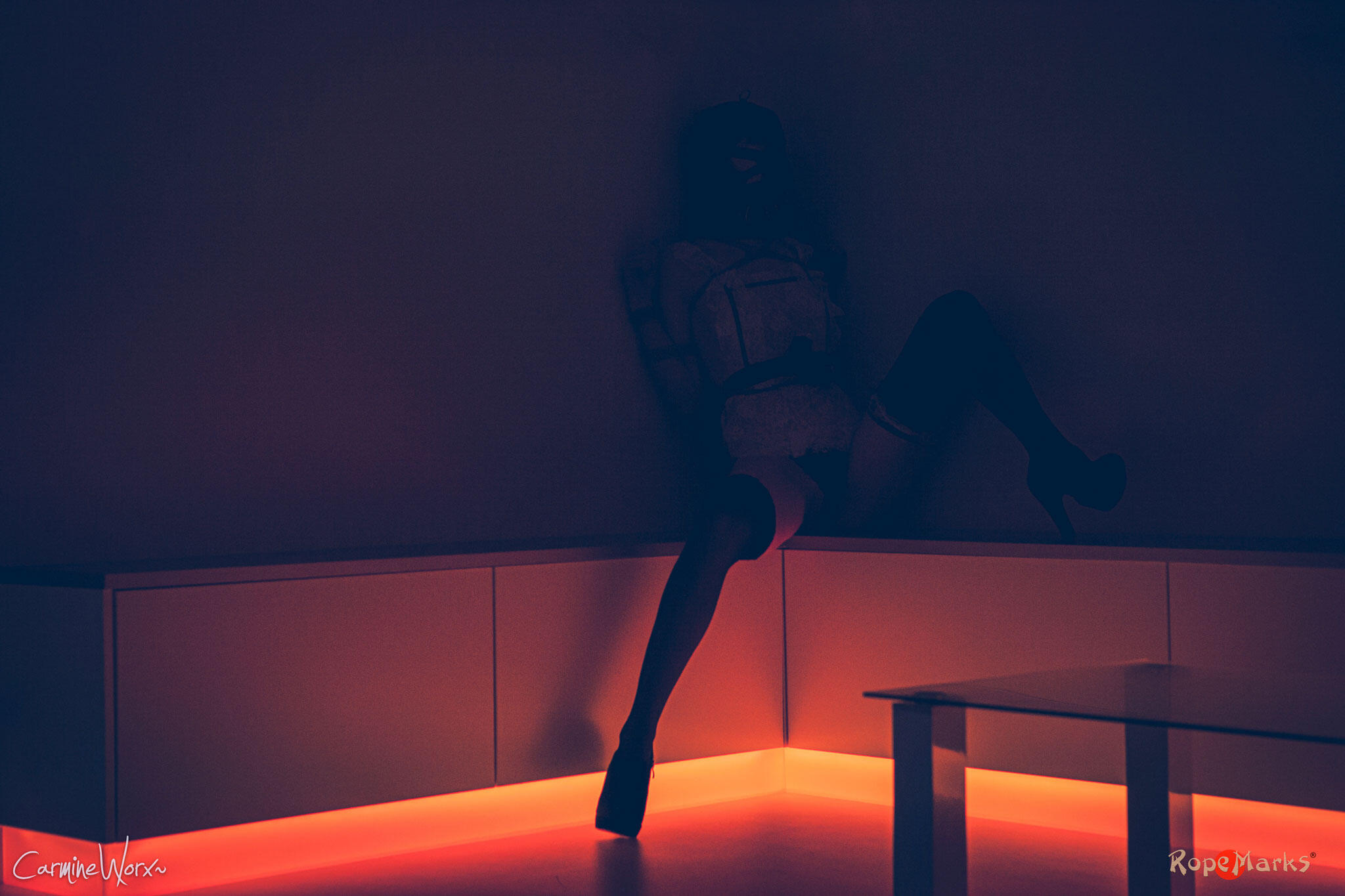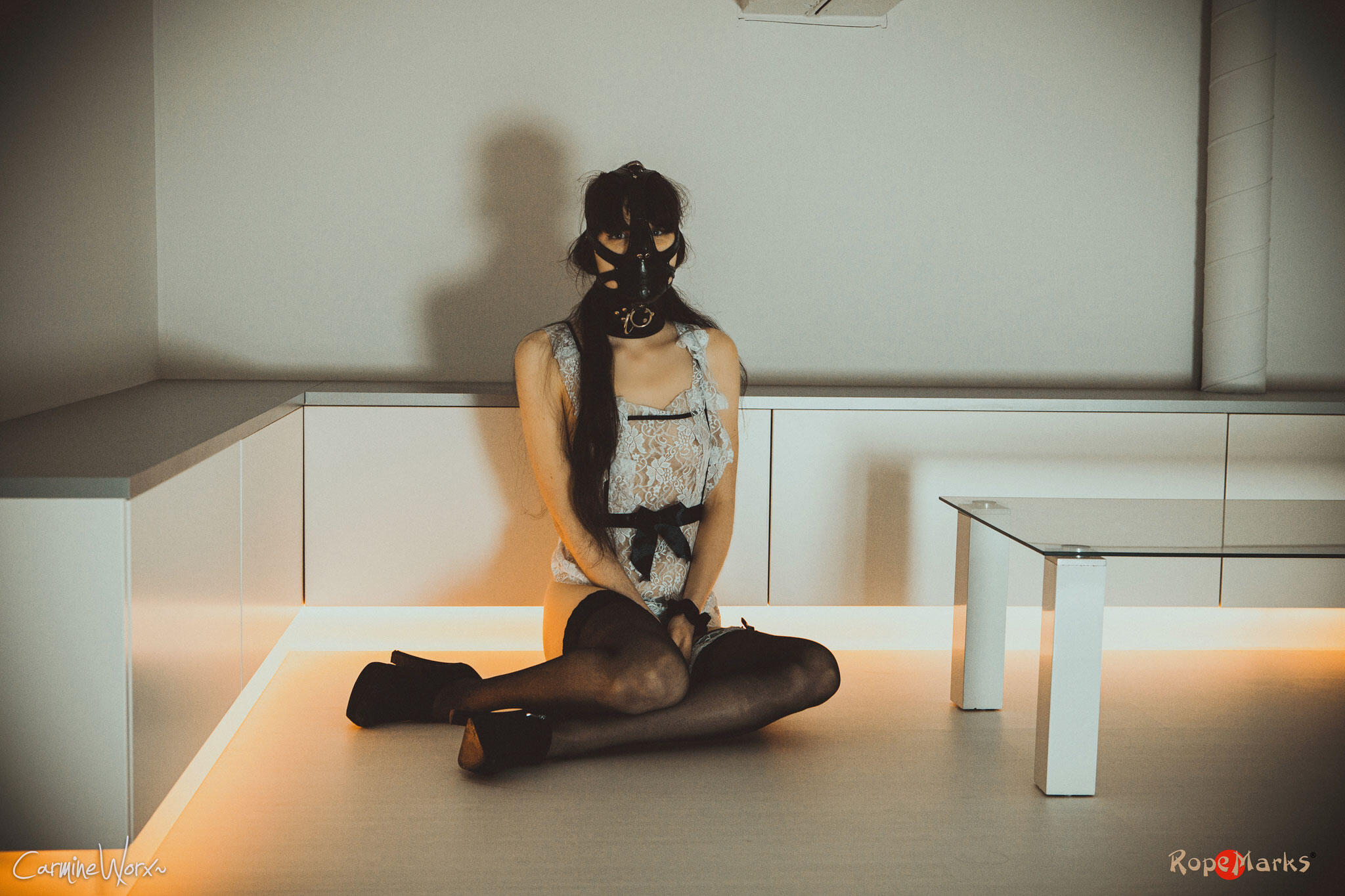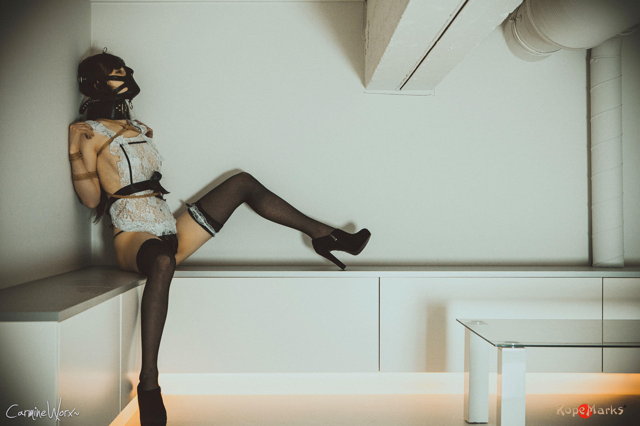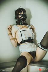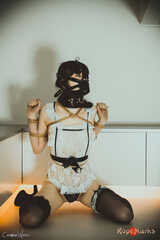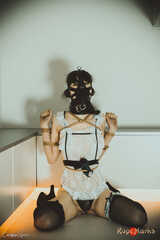 Our maid gets collared, gagged and muzzled before anything else. Wearing this for prolonged time. Then she gets tied in a tengu-tie. Personally I find this one has the sole purpose of serving dick. Now, let that be just the very proper activity for a maid...