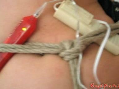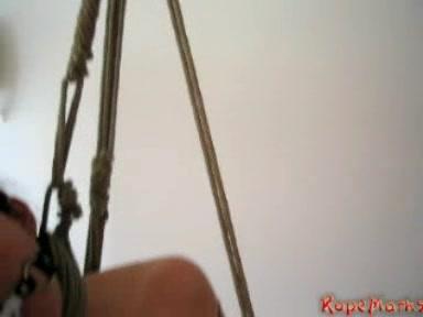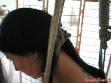 This session started with Chantal wearing a very wide and tight collar. I put her hands in leather mittens then strapped her arms behind her back in a leather armbinder. After watching Chantal struggle in her bondage, for a comfortable position for her neck and for breath I got a new idea to do to her! I tied Chantal of RopeMarks in a kata-ashi tsuri and tied a rope-collar around her neck. Then, she is allowed her fun (as long as I get mine :), inserted a vibrating egg and clipped on a vibrating egg! The only thing left to do was connect a rope from her collar to the ceiling hook, in effect doing breath play to Chantal. She could relieve herself (read: get air!) by standing on her toes of one leg. This is hard and tiring. She has to switch between standing on toes, getting air and standing comfortable on her foot, doing breath play to herself. The struggle that evolved before my eyes was wonderfully sadistic and I didn't help by gagging my struggling and suffering Chantal...