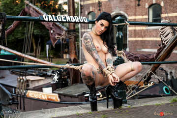 When finally someone in the building wakes up and spots us we move to a different spot - the galgenbrug (gallowsbridge), a name that refers to the view of the gallows of the Volewijck from here. Feeling nostalgic we try to honor the name, we squat Nereida, tie her legs spread and unable to stand up "hang" her from the bridge railing by the neck.