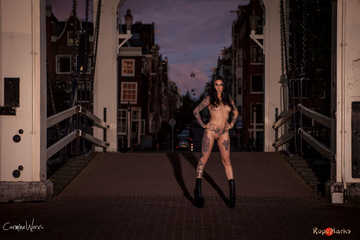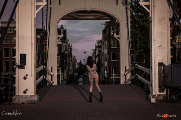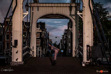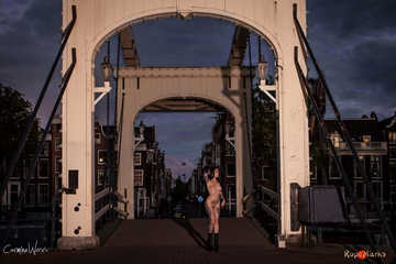 First we arrive at one of Amsterdam's most beautiful spots to watch the sunrise, the skinny bridge across the Amstel. We tie the arms of beautiful Nereida on her back and position her on the bridge. Even early mornings Amsterdam is a busy place and we have quite a few pedestrians and cyclist passing by. When Nereida tries to hide from them we have no other option then to tie her to the bridge for the final set of images.