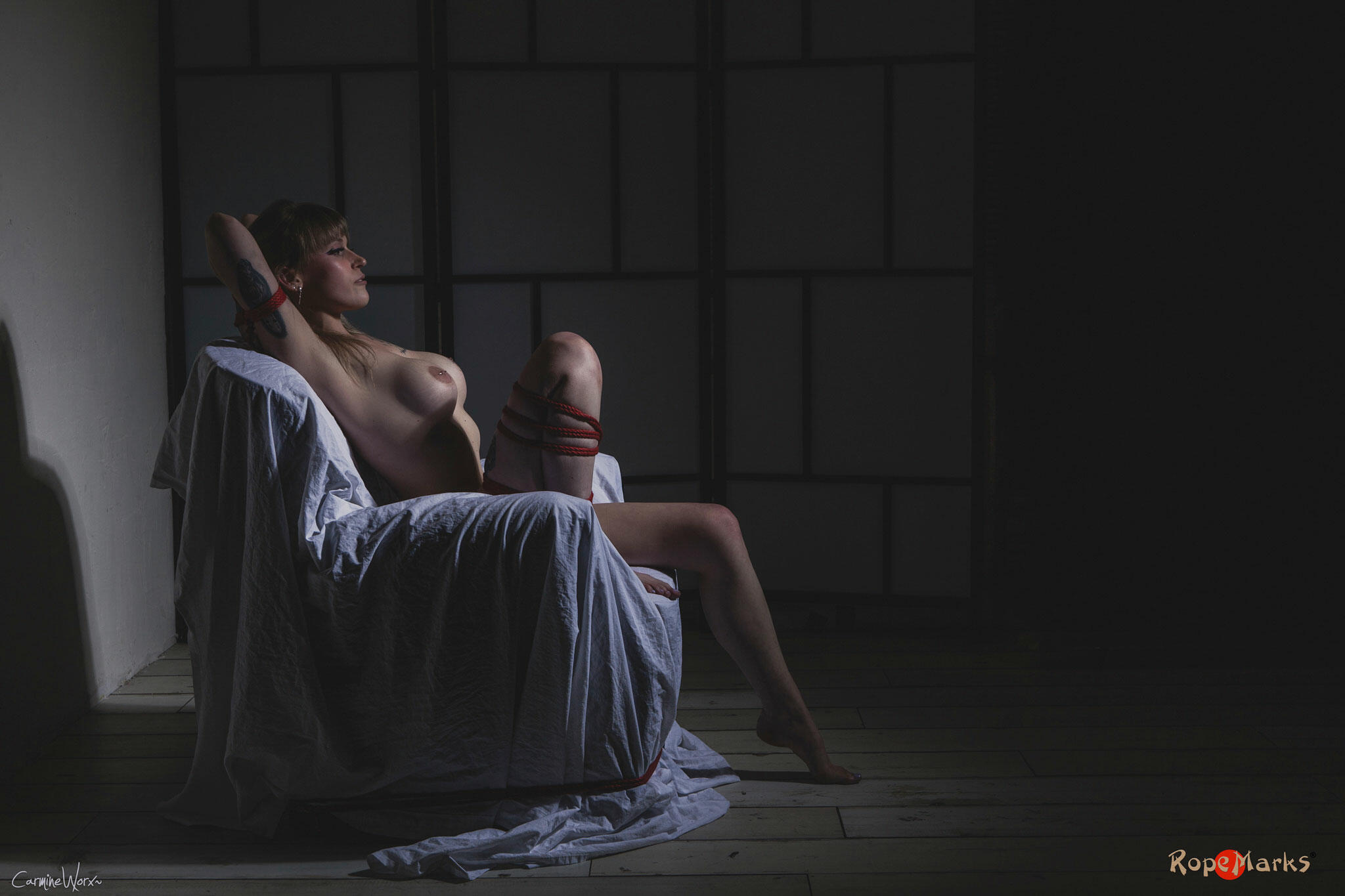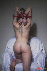 I went all classic on the classic beauty that is Melody. She got tied in a M-ji-kaikyaku shibari, a classic open-leg chair tie. She went all mmmmmmm so I had to make her go mmpf.