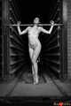 DutchDame's wrist and neck are tied to a solid metal bar while she is on tiptoes. From here we let time do its work; tire her calf muscles or hang herself... She is a lot stronger than we anticipated so we decided to up the challenge for her by tying her ankles together and adding a crotchrope. With the crotchrope we pull her off balance and from time to time she has to "hang" herself to get her feet back underneath her... a beautiful challenge to witness!